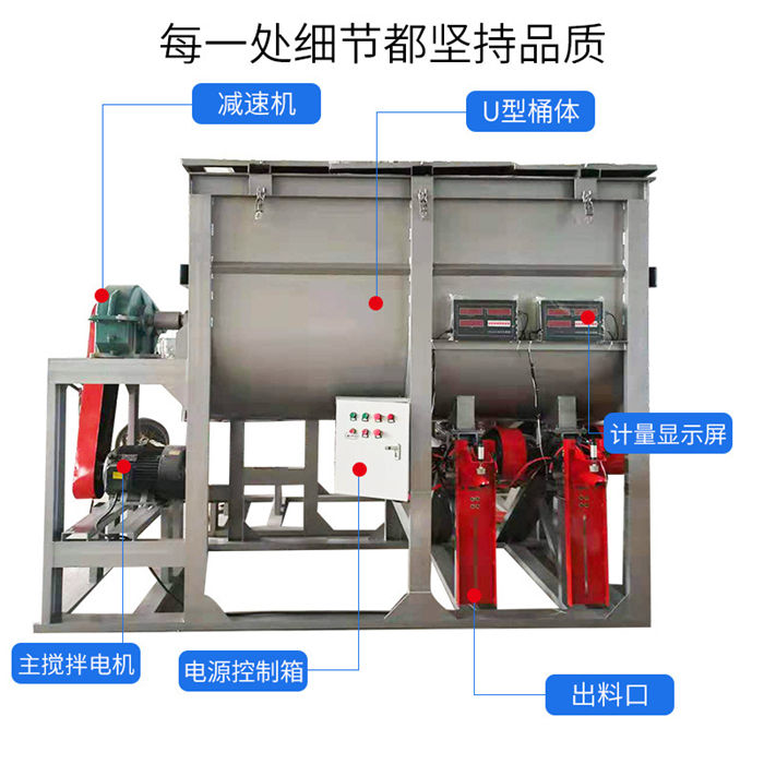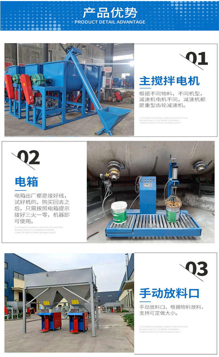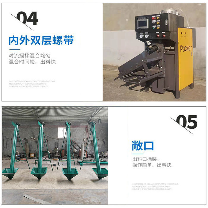 該設備為全自動干粉砂漿攪拌機,整機四角加上料計量,適合多種物料混合的攪拌,設定好斤稱之后,物料由提升機上料,斤稱達到自動停止,然后接著上第二種物料,以此類推,計量準確,省時省力;出料系統設計也是電腦計量裝置,無需人工二次稱重,閥口袋包裝,無需再次封口,出料速度快,4秒一袋,1人即可操作,省時省力;攪拌機機身為臥式U型筒體,內部由內外兩層螺帶交錯布置,攪拌均勻,混合速度快,5至8分鐘即可攪拌均勻,出料可根據不同物料的實際需求定做多個出料口。